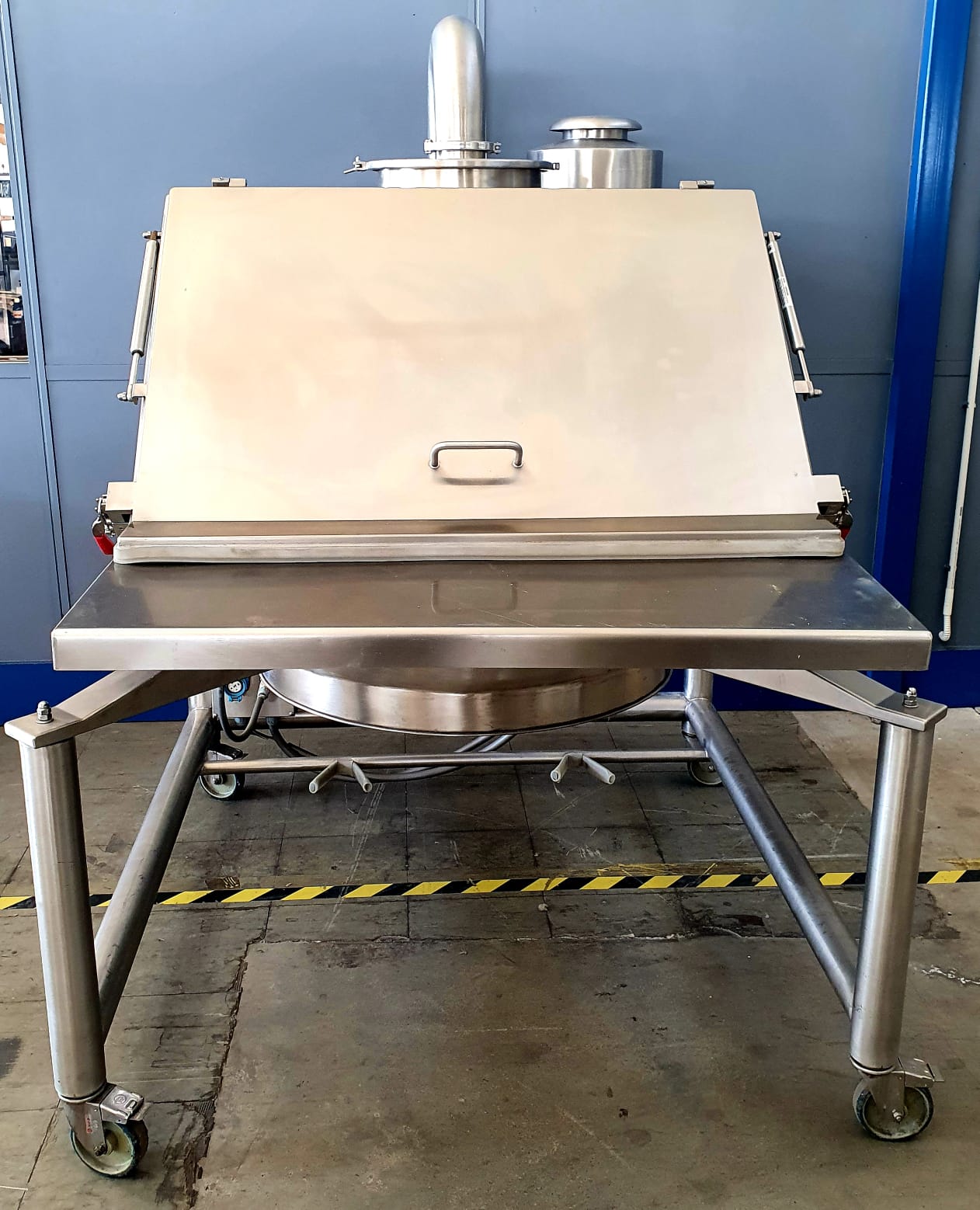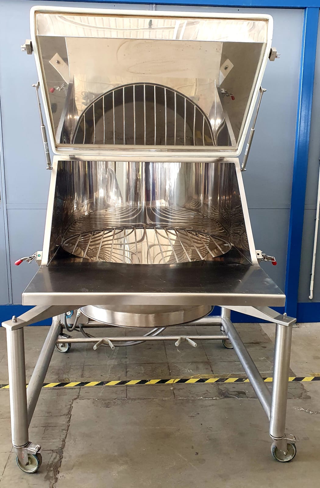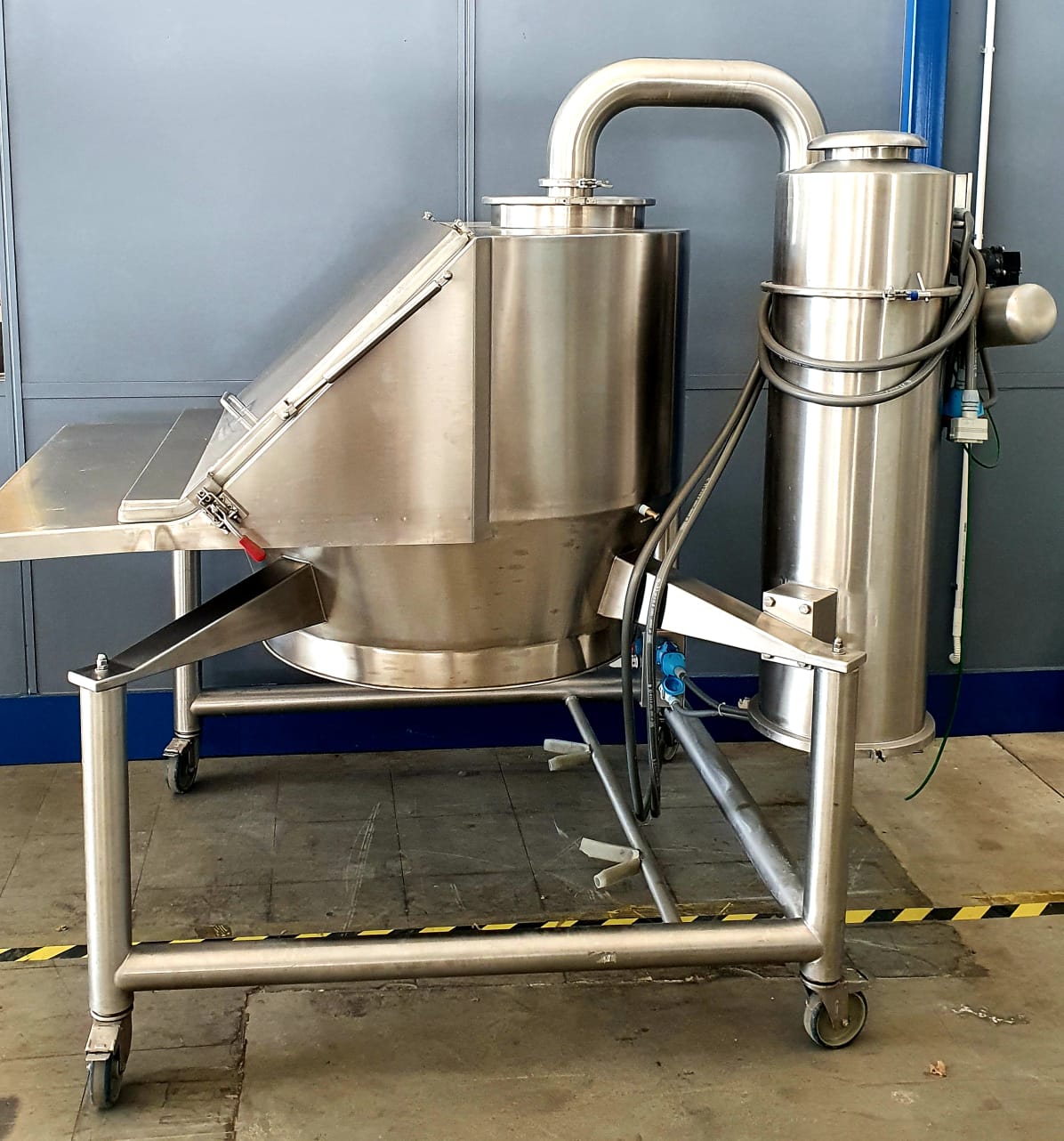 KEY FEATURES: The unit is built with a stainless steel structure and includes a loading area with grid and discharge section, designed for orderly operation and reduced material dispersion during emptying. An opening protective cover with side supports is provided to help contain dust during bag emptying. Dust extraction system included, with the possibility to connect a vibro sifter.
