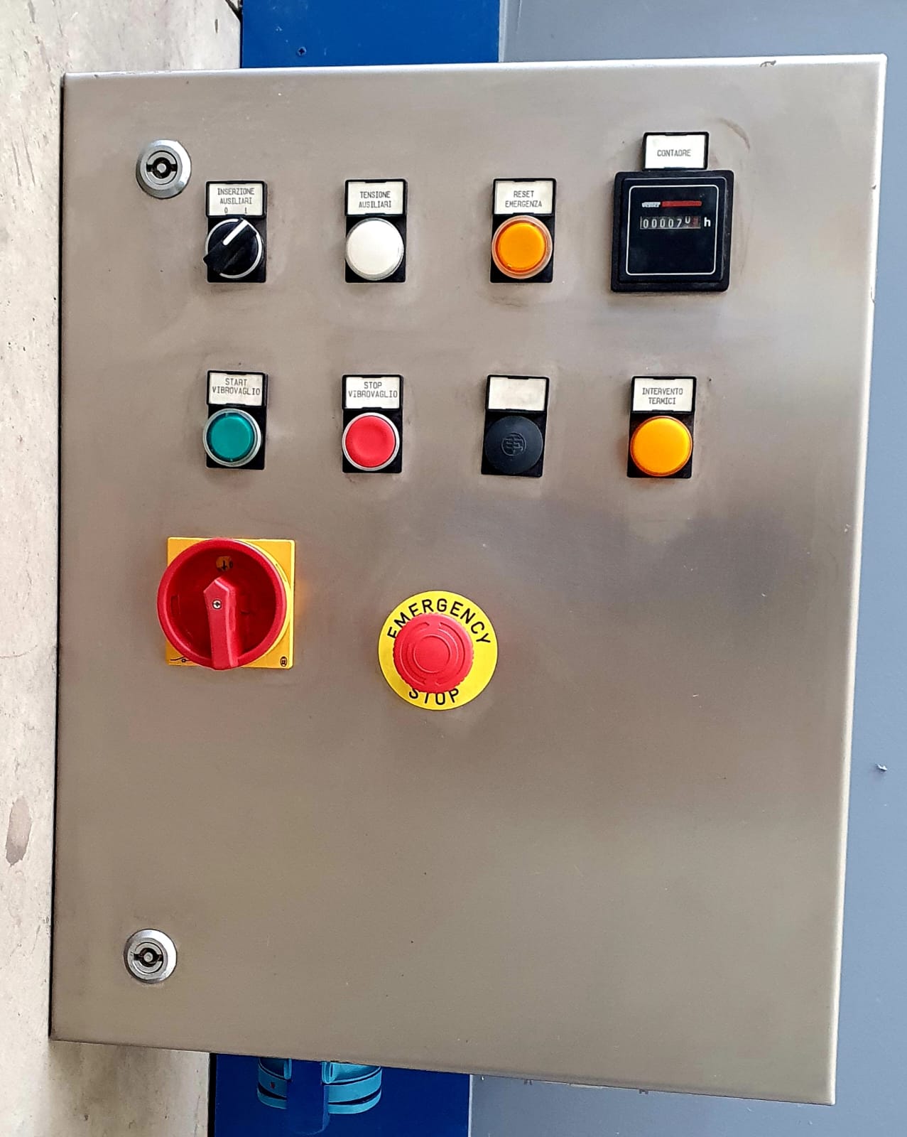 Bag emptying machine with support grid, product conveying hopper and control panel for vibro sifter management.
