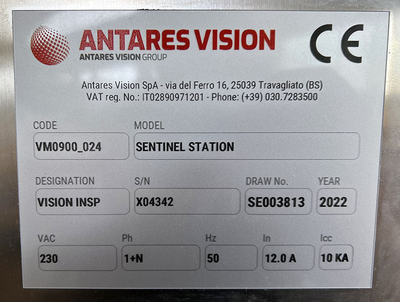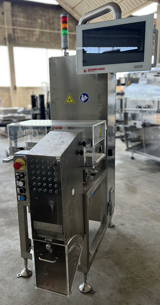 KEY FEATURES: The Antares Vision Sentinel Station is an advanced control station designed to ensure total product integrity on packaging lines. Using artificial vision technology, this system performs rigorous checks on labels, codes (OCR/OCV), cap integrity, and fill levels. As a 2022 model, it features modern electronics and updated software, making it an ideal solution for the pharmaceutical and nutraceutical sectors where traceability and quality control are essential. The stainless steel structure and compact design allow for easy integration into existing automatic lines.