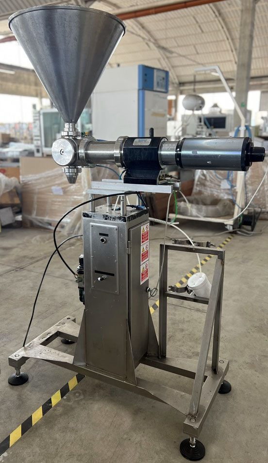 ELEMENTI CHIAVE: Dosatrice industriale a pistone con tramoggia conica in acciaio inox, progettata per il dosaggio preciso di prodotti densi e altamente viscosi. La regolazione volumetrica è manual tramite ghiera graduata.