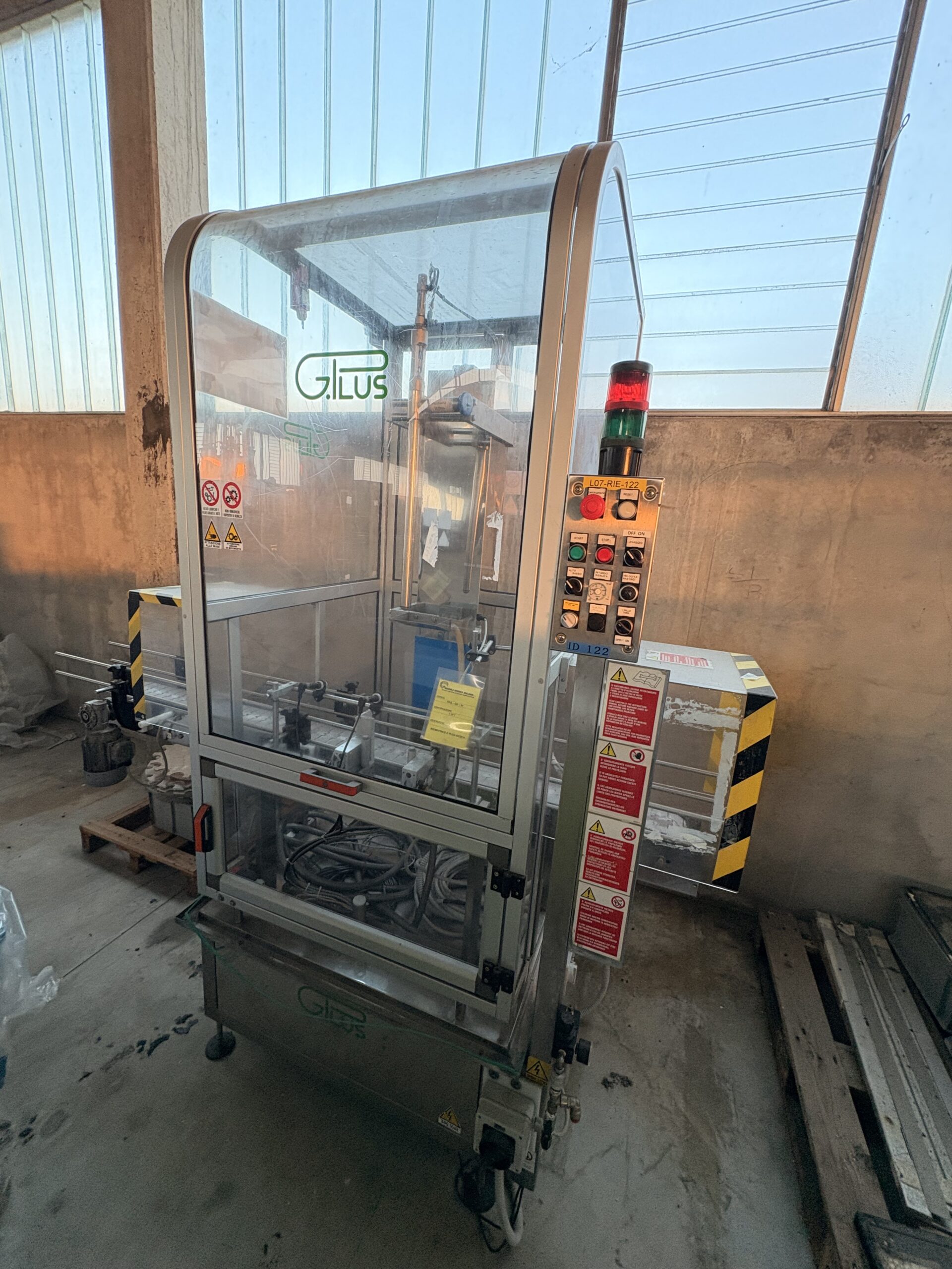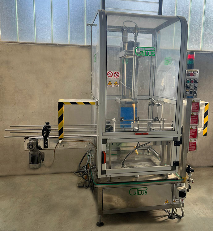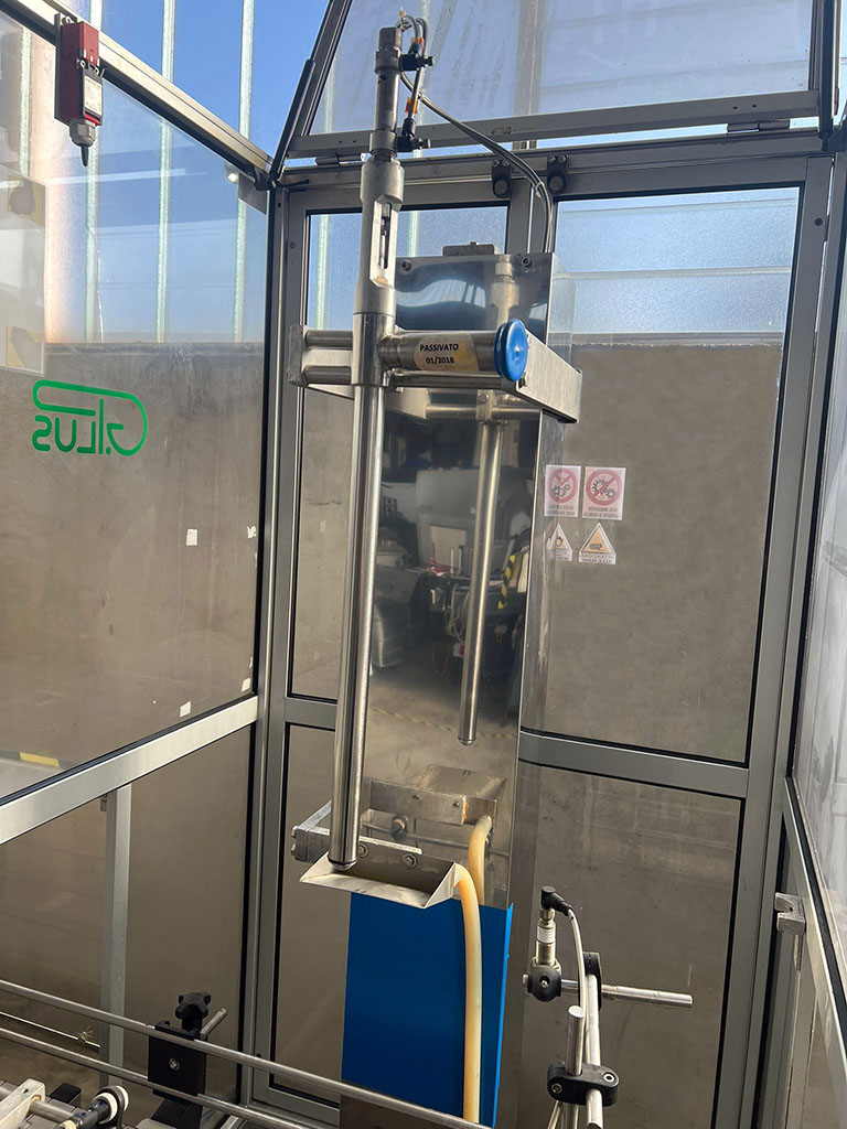 ELEMENTI CHIAVE: La tanica viene introdotta sul nastro, centrata tramite guide laterali regolabili e riempita mediante una testa discendente che entra nel collo del contenitore per garantire maggiore precisione e riduzione di spruzzi o schiume. Il quadro comandi a bordo macchina permette il controllo completo del ciclo: start/stop, emergenza, regolazione velocità nastro e lavaggio linea.