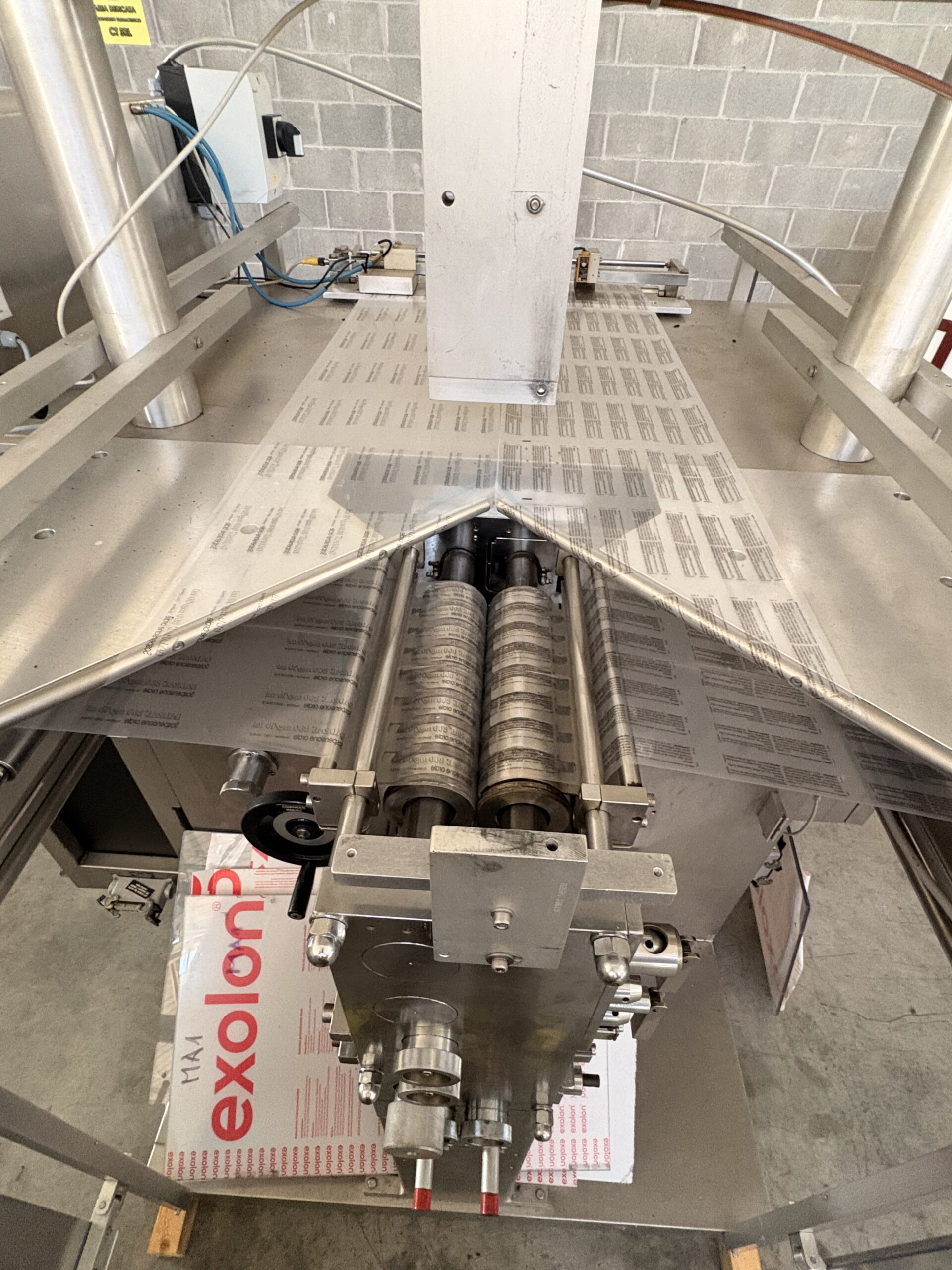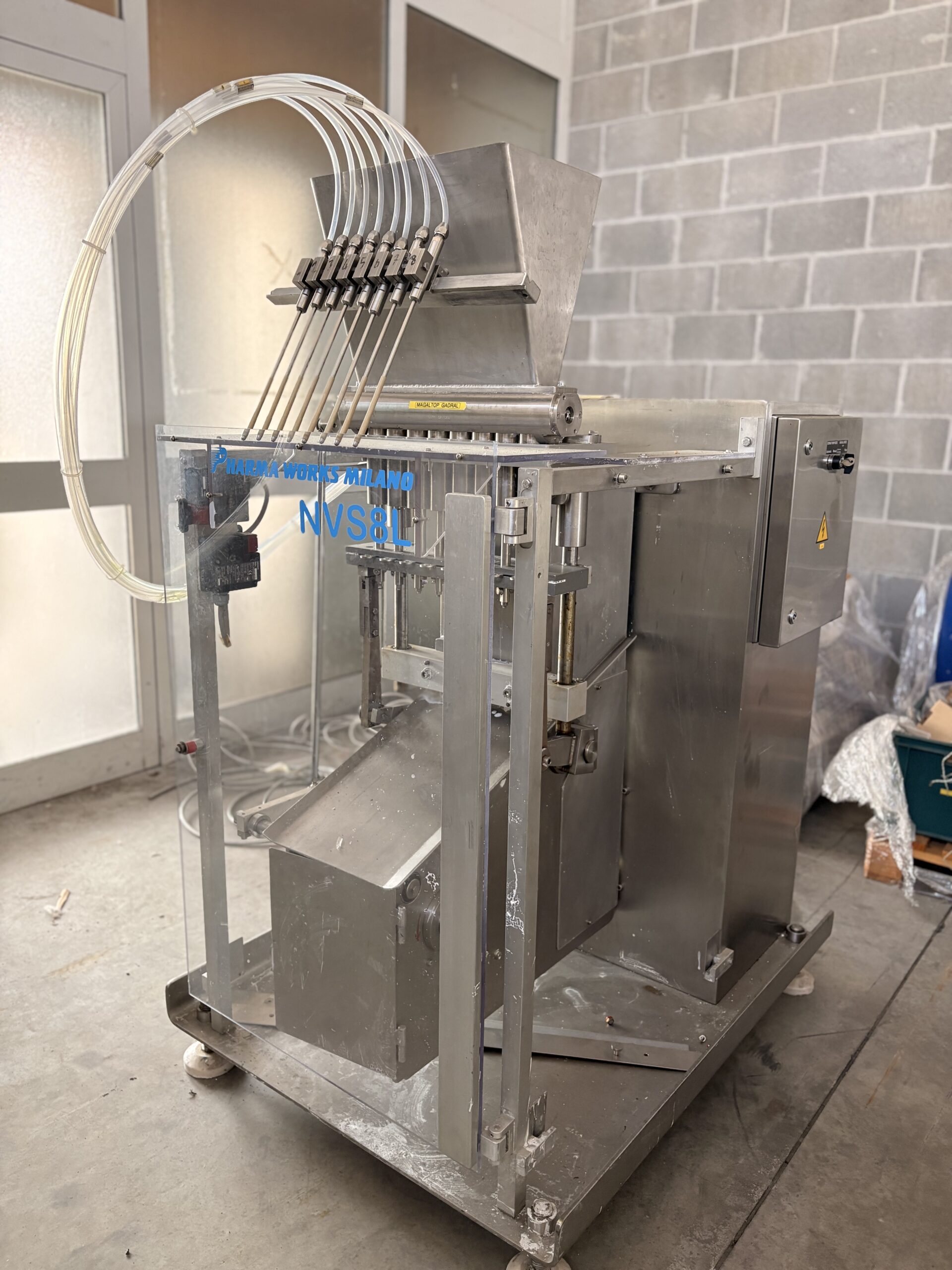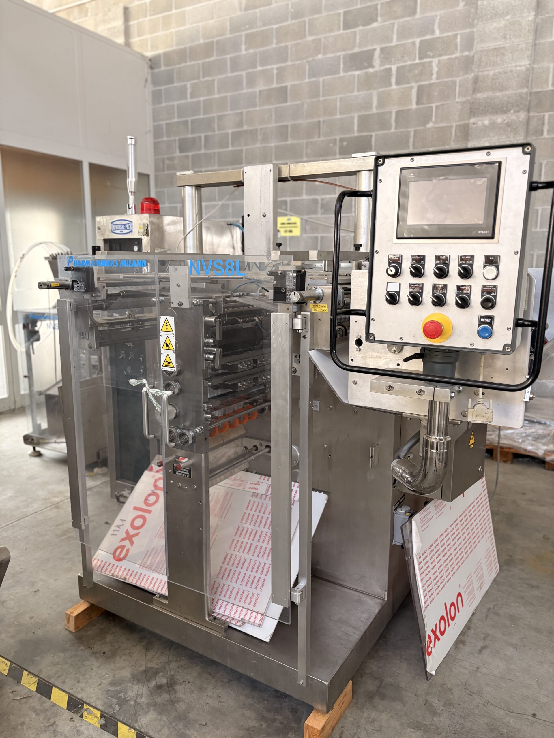 ELEMENTI CHIAVE: Macchina multivia progettata per produzioni ad alta velocità partendo da bobina di film termosaldabile in piano. Il sistema forma il tubo di film, dosa simultaneamente su otto canali, esegue la saldatura longitudinale continua e la saldatura trasversale intermittente, quindi taglia e separa le bustine in modo perfettamente sincronizzato. La macchina è fornita completa di dosatore dedicato per prodotti semi-liquidi, stampante ink-jet integrata, set di ricambi, manuali d’uso e manutenzione.