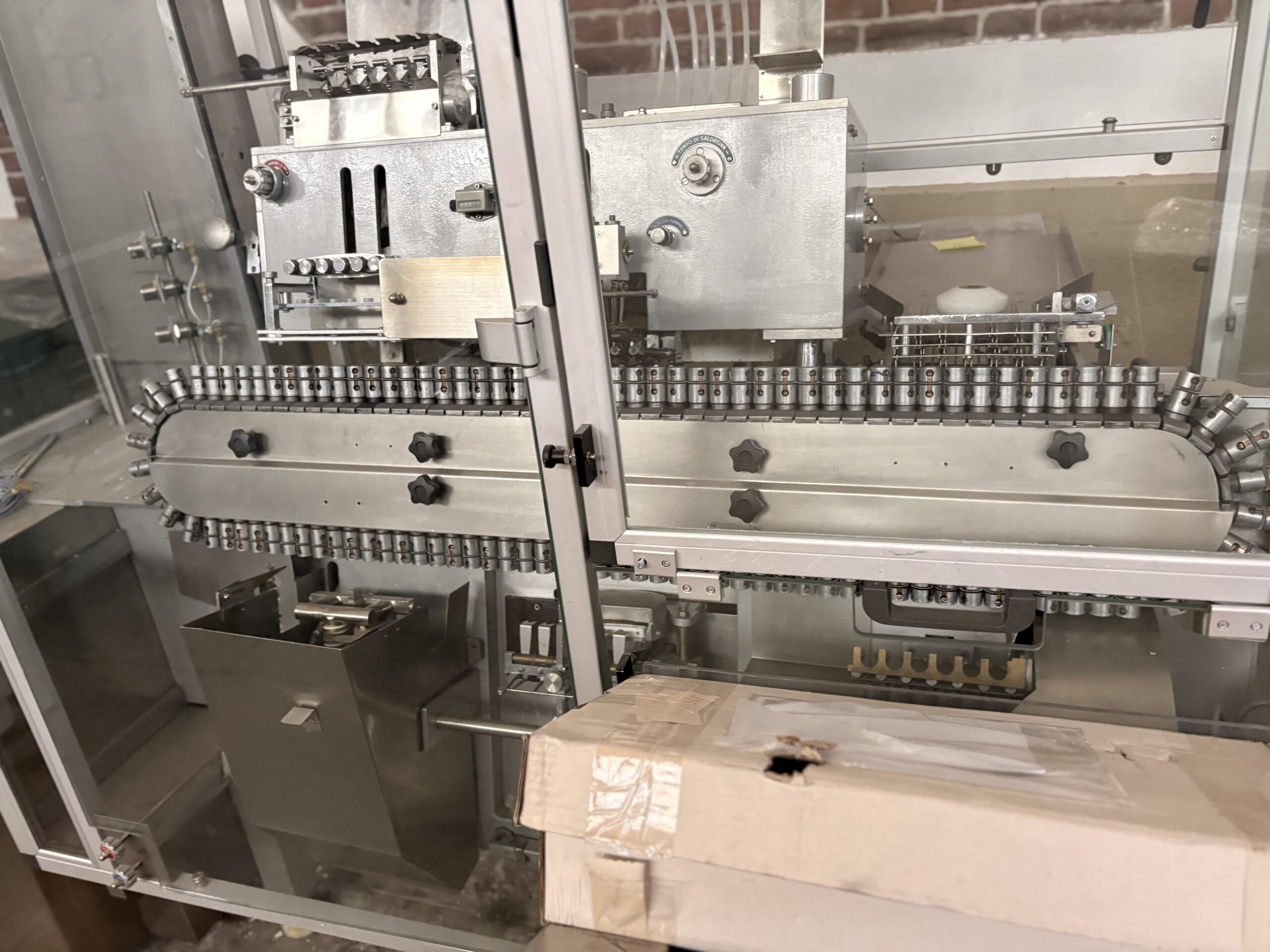 ELEMENTI CHIAVE: Sistema di movimentazione automatica che gestisce sei contenitori per ciclo con caricamento, capovolgimento, apertura, dosaggio, sigillatura e scarico automatici. Il processo è eseguito in ambiente controllato.